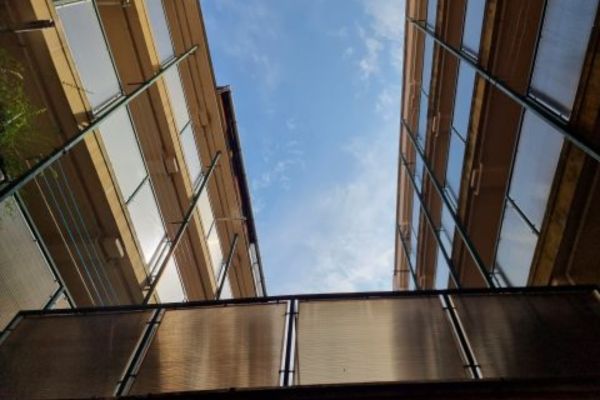 Het appartement bevindt zich in een bakstenen gebouw met vier verdiepingen en is een hoekappartement. Het is Oost-West georiënteerd en daardoor zonnig.