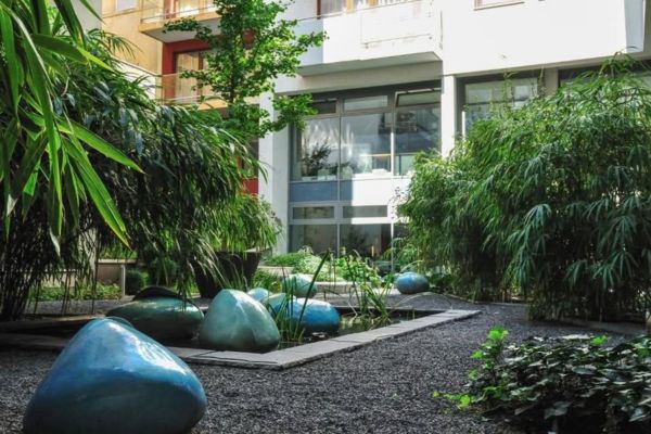 • Binnenplaats: Grote groenvoorziening met een fontein en een klein meer.