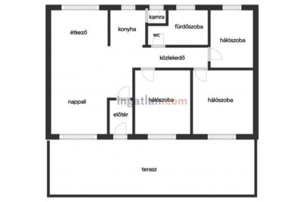 De indeling omvat een woonkamer-eetkamer met keuken, drie slaapkamers en een badkamer met toilet. Er is een terras van 30 m² aanwezig.