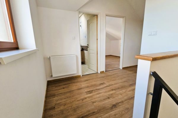 Verdieping: Overloop, één grote slaapkamer en een tweede kamer (die door de schuine wanden effectief als twee halve kamers fungeert), plus een tweede badkamer met toilet.