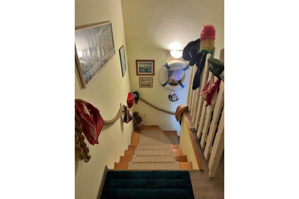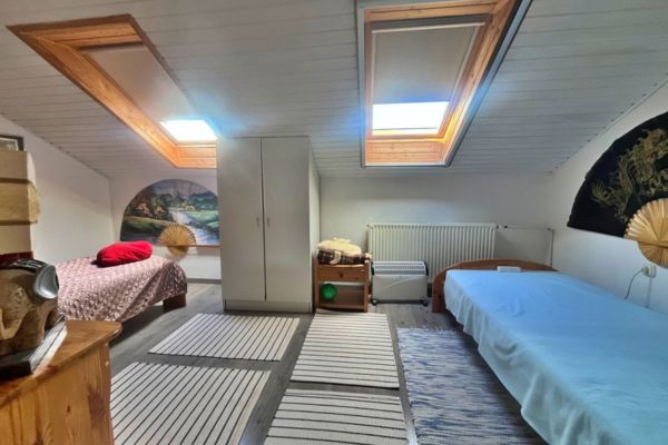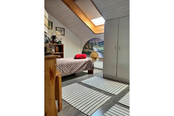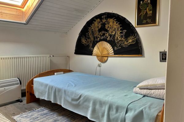 Tweede verdieping: Een ruime kamer, een gezellige “halve” kamer en een tweede badkamer met toilet.
