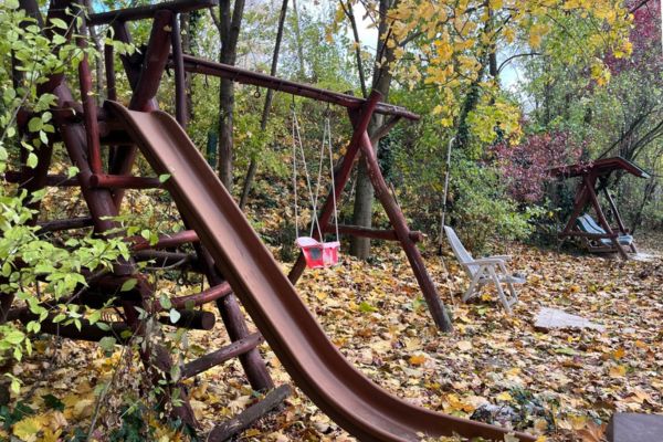 Voor de kinderen: Een degelijke speeltuin gemaakt van boomstammen.