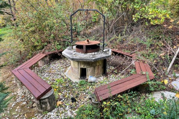 Ontspanning: Een kleine vijver, een barbecueplaats, een rotsgrill en een opblaasbare jacuzzi in de voortuin.